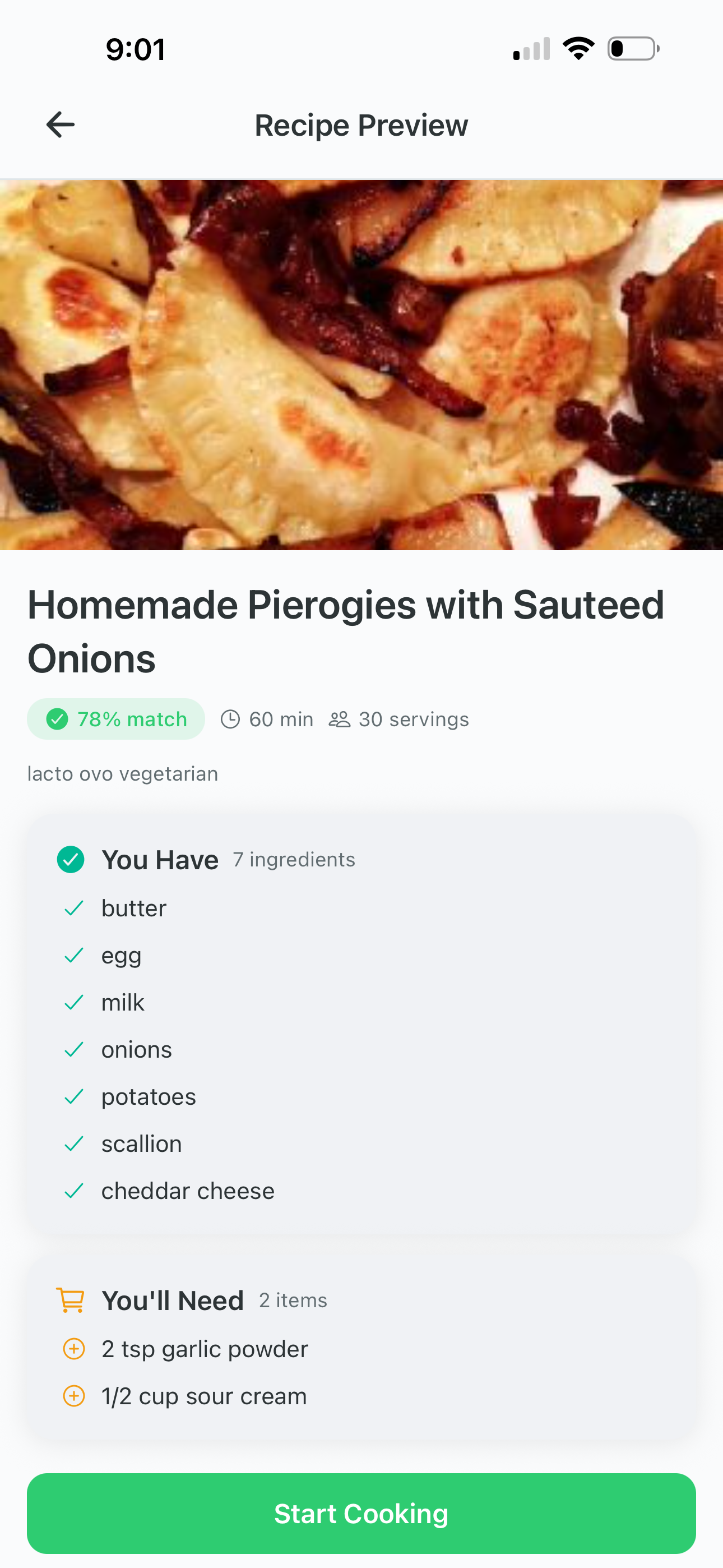 Get recipe suggestions matched to the ingredients you actually have at home.