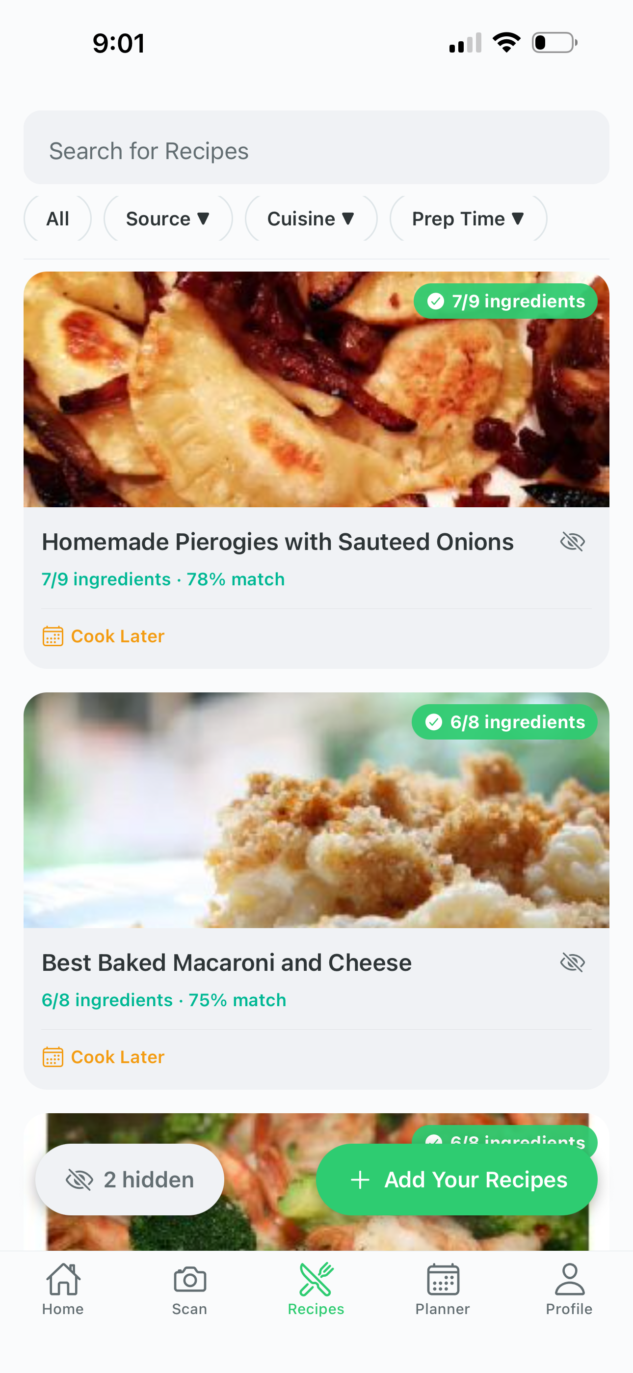 Add your own recipes or scan cookbook pages to build your personal collection.